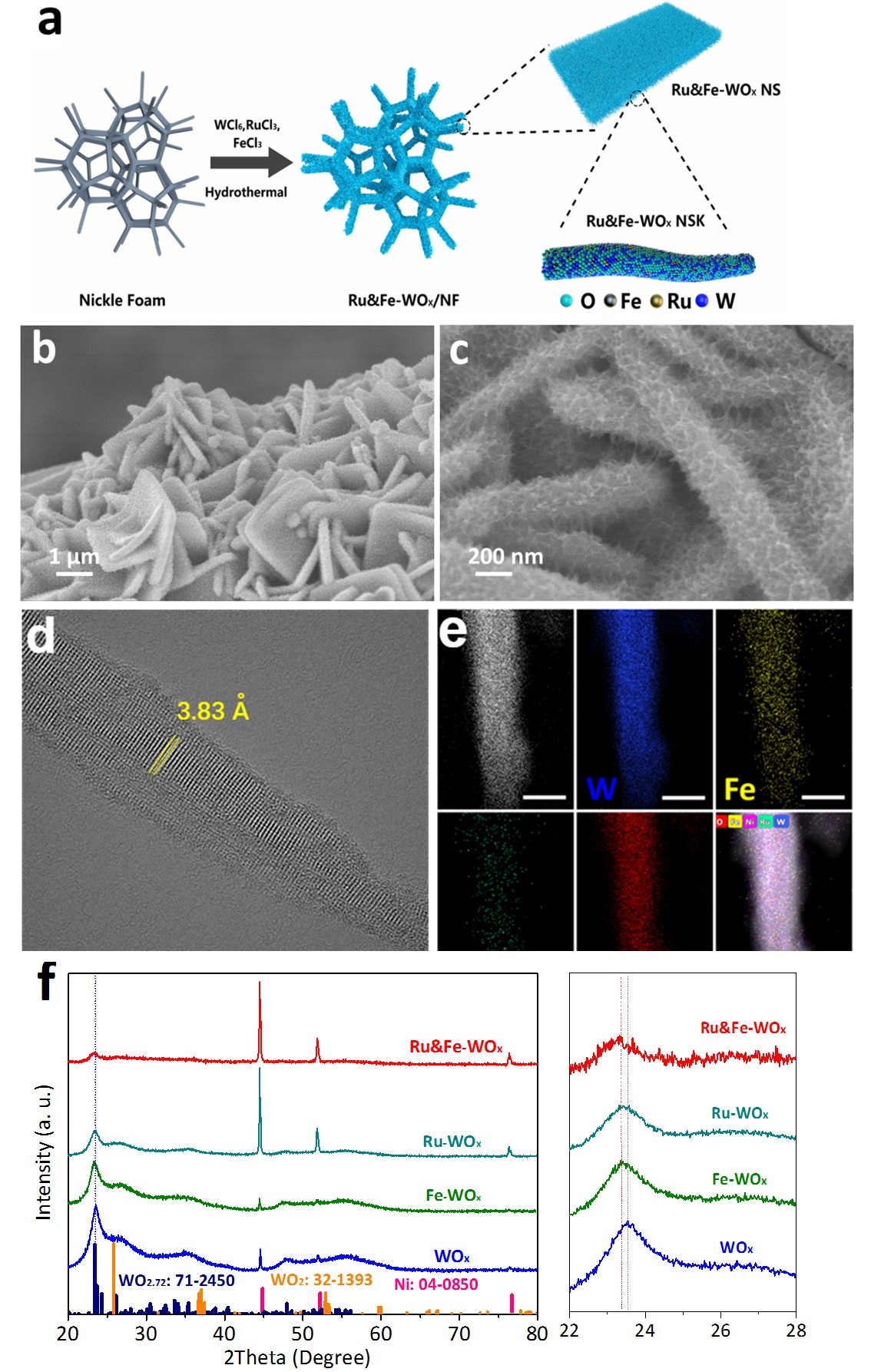 将一定摩尔比的金属盐前驱体溶解于乙醇溶液中,与清洗过的泡沫镍一同水热反应得到负载于泡沫镍上的电催化剂。通过钌与铁的掺杂,得到了具有多级结构的Ru&Fe-WOx电催化剂。