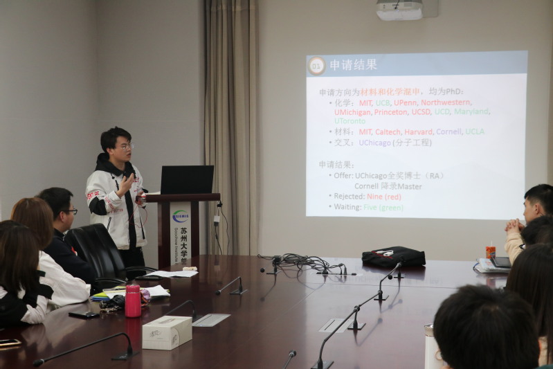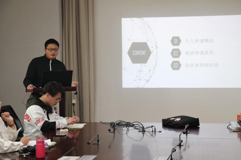 会上,张伯炜和严港斌同学分别就自己的整个出国留学申请流程做了详细的分享。张伯炜同学作为Master申请代表首先介绍了自己的个人申请概况,随后讲述了Master的申请条件并提出所需要注意的相关事项,最后表达了对学弟学妹们美好的祝愿。