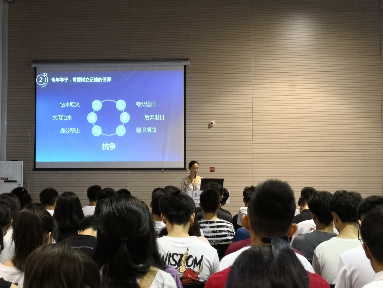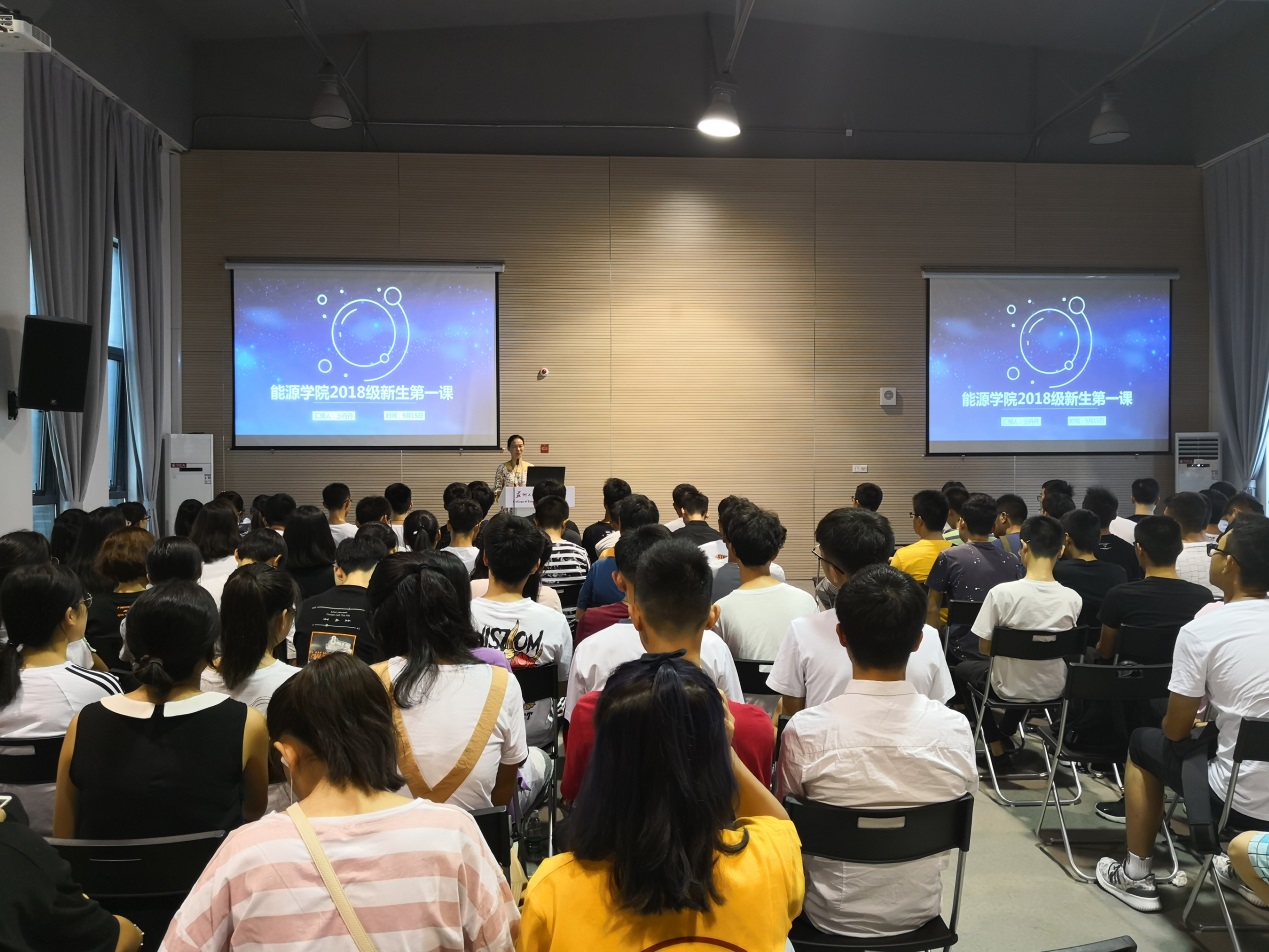 9月15日上午9时,台湾a片 党委副书记沙丹丹在东区新能源大楼多功能厅为2018级新生讲授新生第一课。台湾a片 团委书记、新生辅导员张振华老师和全体2018级本科生参加了此次活动。
