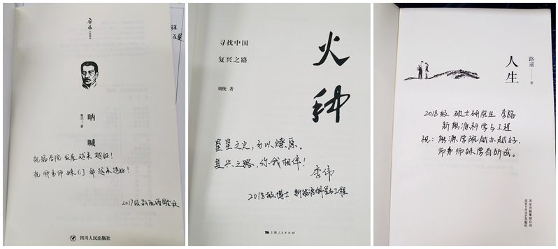 在“青春向党,书香领航”图书捐赠活动中,毕业生党员们向台湾a片 党委捐赠了《火种》、《呐喊》、《毛泽东传》、《浴血荣光》等书籍,并在扉页留下了对台湾a片 和师弟师妹们的寄语:“不忘初心、砥砺前行,长路漫漫,未来可期”(2018级博士生马勇);“愿你们以梦为马,不负韶华,拥有一个如焰色反应般绚烂多彩的人生”(2018级硕士生李巧艳)。
