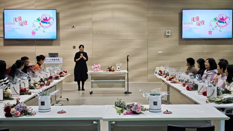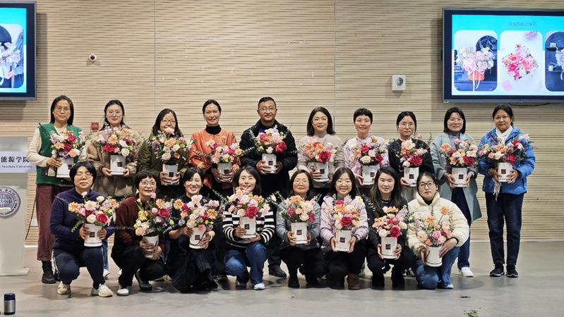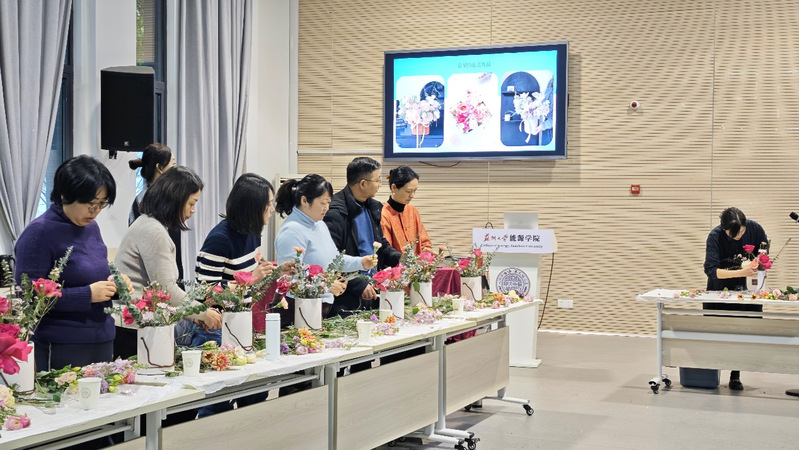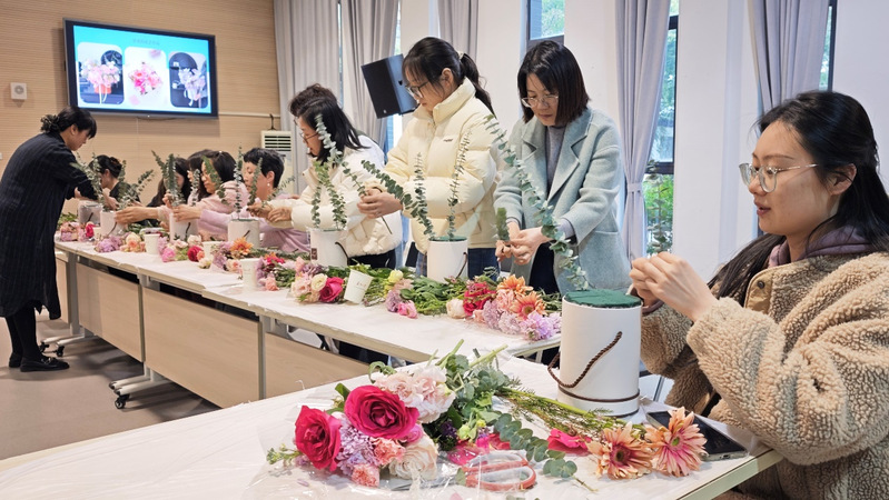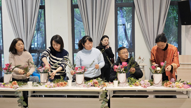 令人兴奋愉悦的插花实践环节更是将活动推向了高潮。在花艺师的悉心指导下,女教职工们纷纷动手,现场进行插花创作。每位参与者都获得了一份精美的花材和专业的工具,在花艺师的启发下,大家充分发挥自己的创意和想象力,亲手制作出独一无二的花艺作品。完成后的作品,不仅承载着每位参与者的心意,更将成为她们节日的专属礼物,带回家中,装点生活。